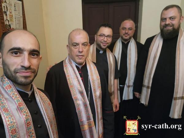 رافق غبطتَه صاحبا السيادة مار برنابا يوسف حبش، ومار أفرام يوسف عبّا، والأباتي إدمون رزق، والمونسنيور حبيب مراد، والمونسنيور عبدو أبو كسم، والأب جان يونس، والأب بول قسّ داود، والأب سعيد مسّوح، والأب يوسف درغام، والأب كريم كلش، والأب أفرام الجزراوي، والأب طارق خيّاط، والأمّ هدى الحلو، والأخت إخلاص شيتو، والدكتورة جويل الترك درغام.