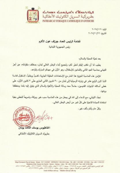 يطيب لنا أن ننشر فيما يلي نصّ الرسالة التي وجّهها غبطة أبينا البطريرك مار اغناطيوس يوسف الثالث يونان بطريرك السريان الكاثوليك الأنطاكي، إلى فخامة الرئيس العماد جوزاف عون، رئيس الجمهورية اللبنانية، لتقديم التهاني بمناسبة العيد الثاني والثمانين لاستقلال لبنان: