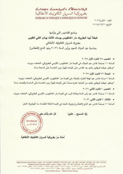 يطيب لنا أن ننشر فيما يلي برنامج القداديس التي يترأسهاغبطة أبينا البطريرك مار اغناطيوس يوسف الثالث يونان بطريرك السريان الكاثوليك الأنطاكي بمناسبة عيد الميلاد المجيد ورأس السنة ٢٠٢٦ وعيد الدنح (الغطاس):