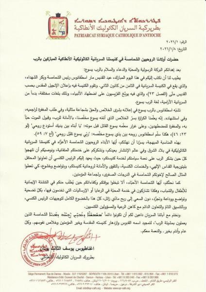 يطيب لنا أن ننشر فيما يلي نصّ الرسالة الأبوية التي وجّهها غبطة أبينا البطريرك مار اغناطيوس يوسف الثالث يونان بطريرك السريان الكاثوليك الأنطاكي، إلى الشمامسة في كنيستنا السريانية الكاثوليكية الأنطاكية، في يوم عيدهم، بمناسبة عيد مار اسطفانوس رئيس الشمامسة وبكر الشهداء، والواقع في الثامن من كانون الثاني:
