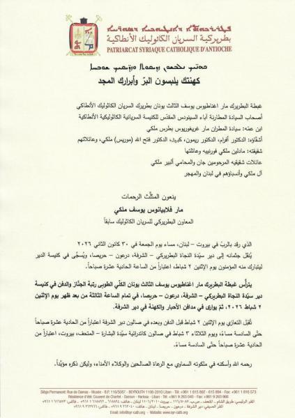 ننشر فيما يلي نص النعي الرسمي للمثلَّث الرحمات مار فلابيانوس يوسف ملكي المعاون البطريركي للسريان الكاثوليك سابقاً: