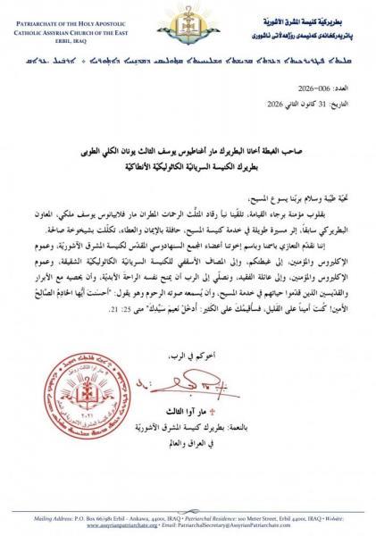 ننشر فيما يلي نصّ رسالة التعزية التي وجّهها صاحب القداسة مار آوا الثالث بطريرك كنيسة المشرق الآشورية إلى غبطة أبينا البطريرك مار اغناطيوس يوسف الثالث يونان بطريرك السريان الكاثوليك الأنطاكي، للتعزية بوفاة المثلَّث الرحمات المطران مار فلابيانوس يوسف ملكي: