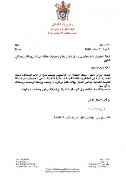 ننشر فيما يلي نصّ رسالة التعزية التي وجّهها صاحب الغبطة الكردينال مار لويس روفائيل ساكو بطريرك الكنيسة الكلدانية في العراق والعالم إلى غبطة أبينا البطريرك مار اغناطيوس يوسف الثالث يونان بطريرك السريان الكاثوليك الأنطاكي، للتعزية بوفاة المثلَّث الرحمات المطران مار فلابيانوس يوسف ملكي: