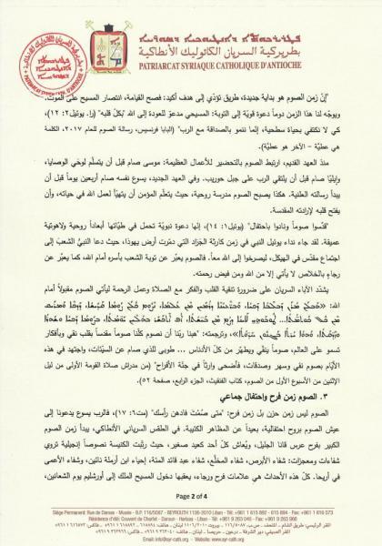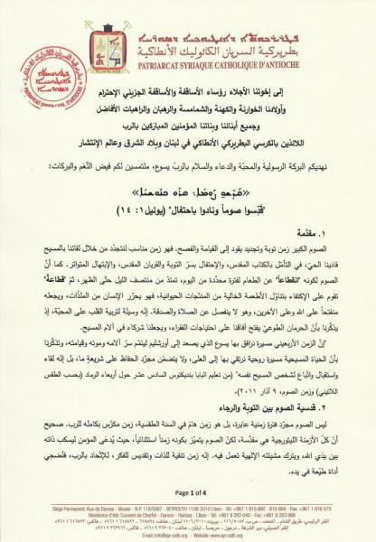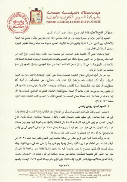 يطيب لنا أن ننشر فيما يلي النص الكامل لرسالة الصوم الكبير لعام 2026 لغبطة أبينا البطريرك مار اغناطيوس يوسف الثالث يونان بطريرك السريان الكاثوليك الأنطاكي، بعنوان "قَدِّسوا صوماً ونادوا باحتفال":