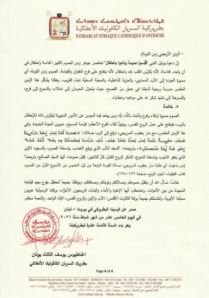 ختاماً، نسأل الله أن يتقبّل صومكم وصلاتكم وتوبتكم وصدقتكم، ويؤهّلنا جميعاً لنحتفل بفرح بعيد قيامته المجيدة من بين الأموات. ونمنحكم، أيّها الإخوة والأبناء والبنات الروحيون الأعزّاء، بركتنا الرسولية عربون محبّتنا الأبوية. ولتشملكم جميعاً بركة الثالوث الأقدس: الآب والإبن والروح القدس، الإله الواحد. والنعمة معكم.