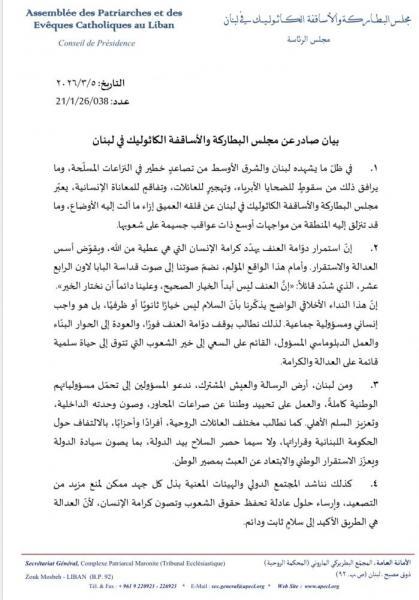 1. في ظلّ ما يشهده لبنان والشرق الأوسط من تصاعدٍ خطير في النزاعات المسلّحة، وما يرافق ذلك من سقوطٍ للضحايا الأبرياء، وتهجيرٍ للعائلات، وتفاقمٍ للمعاناة الإنسانية، يعبّر مجلس البطاركة والأساقفة الكاثوليك في لبنان عن قلقه العميق إزاء ما آلت إليه الأوضاع، وما قد تنزلق إليه المنطقة من مواجهات أوسع ذات عواقب جسيمة على شعوبها.