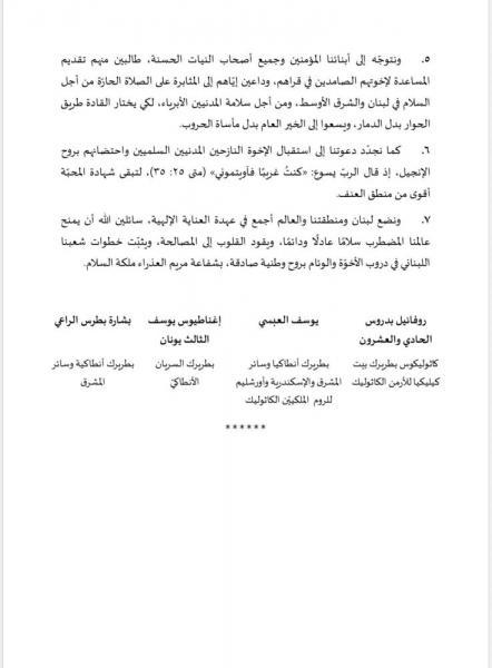 5. ونتوجّه إلى أبنائنا المؤمنين وجميع أصحاب النيات الحسنة، طالبين منهم تقديم المساعدة لإخوتهم الصامدين في قراهم، وداعين إيّاهم إلى المثابرة على الصلاة الحارّة من أجل السلام في لبنان والشرق الأوسط، ومن أجل سلامة المدنيين الأبرياء، لكي يختار القادة طريق الحوار بدل الدمار، ويسعوا إلى الخير العام بدل مأساة الحروب.