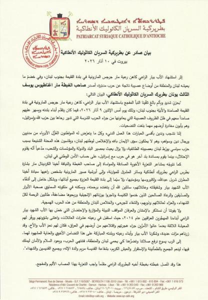 بيان صادر عن بطريركية السريان الكاثوليك الأنطاكية