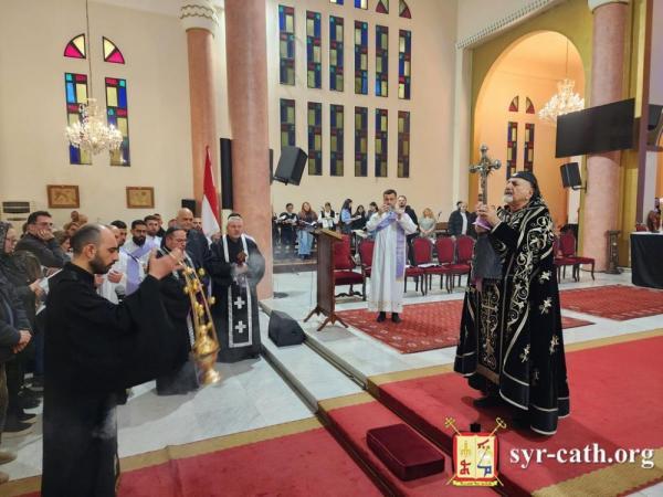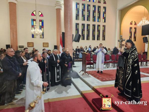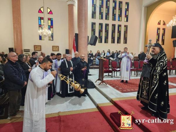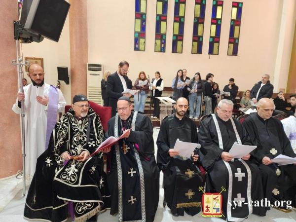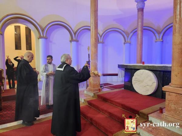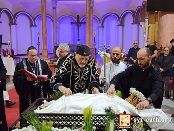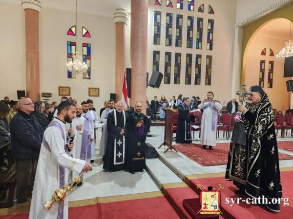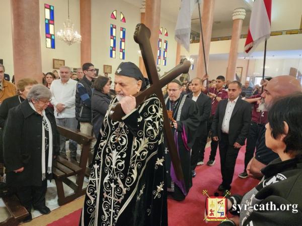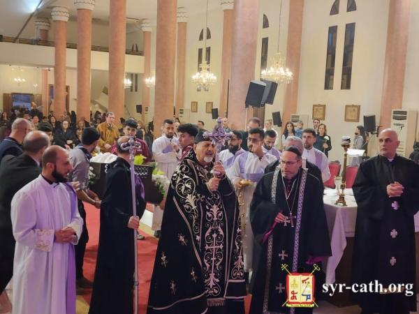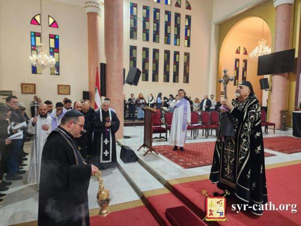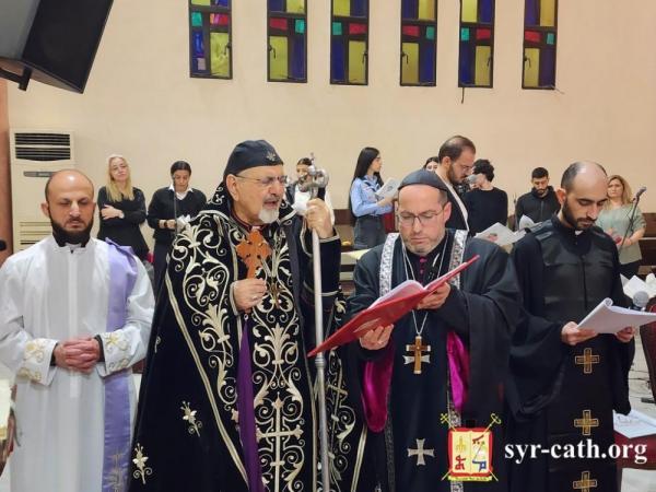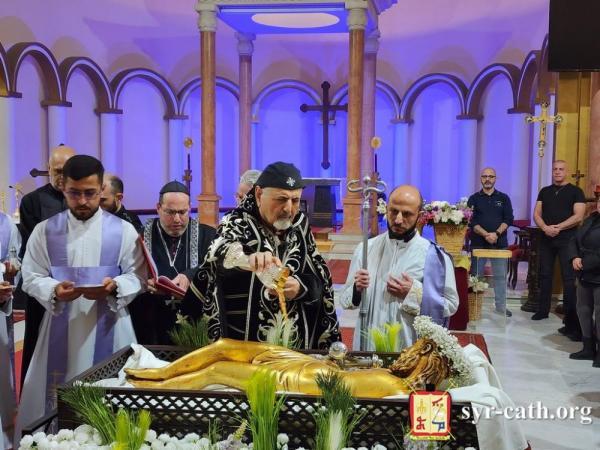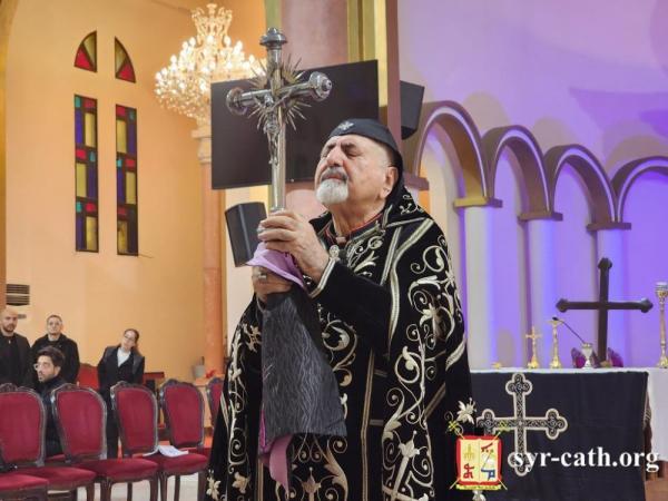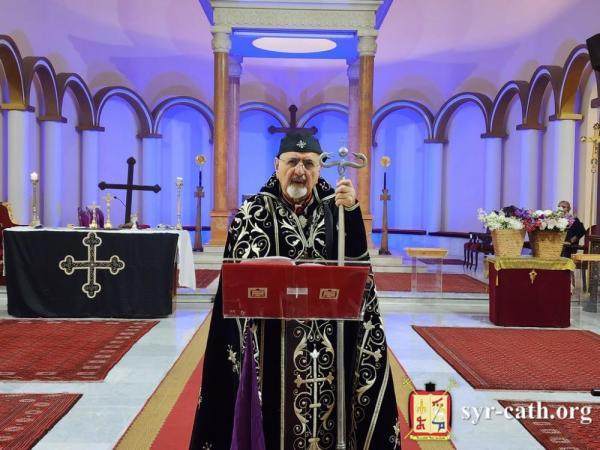 ونوّه غبطته "بأنّكم بالتأكيد تابعتم على وسائل التواصل الإجتماعي والتلفزيون وقائع الصلوات والأناشيد والرتب التي ينفرد بها هذا اليوم. وها أنتم تشاركون شخصياً بهذه الرتبة السرّية العميقة المعاني. رتّلنا مع الجوقة أناشيد سريانية قديمة، فضّلْنا أن نحافظ عليها، لأنّ هذه الأناشيد هي إرثنا السرياني، ونحن مدعوون أن نعيش هذا الإرث، ولا نخجل أن نتعلّمه وننشده ونعيشه، ولو كنّا في مجتمعات تفرض علينا لغتها. لكن، نحن السريان، علينا أن نحافظ على هذا الإرث الذي أتانا من قرون قديمة، ويعبِّر عن غنى طقسنا السرياني". رتّلنا «ܨܠܺܝܒܳܟ ܚܰܝܳܐ ܡܫܺܝܚܳܐ ܐܰܠܳܗܳܐ ܕܺܝܠܰܢ܆ ܢܶܗܘܶܐ ܫܽܘܪܳܐ ܚܰܣܺܝܢܳܐ܆ ܠܥܺܕ̱ܬܳܐ ܕܒܳܟ ܐܶܚܕܰܬ݀ ܓܰܘܣܳܐ܆ ܘܬܶܫܬܰܘܙܰܒܝ̱ ܡܶܢ ܢܶܟܝ̈ܳܢܶܐ»، وترجمتها: "صليبكَ الحيّ، أيُّها المسيح إلهنا، هو سور حصين للكنيسة التي التجأت إليك كي تنقذها من المضرّات".